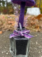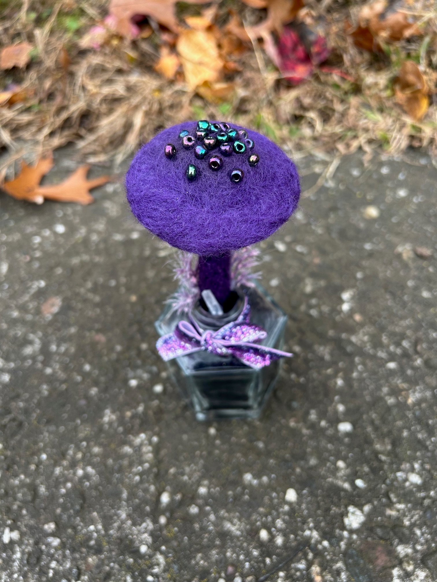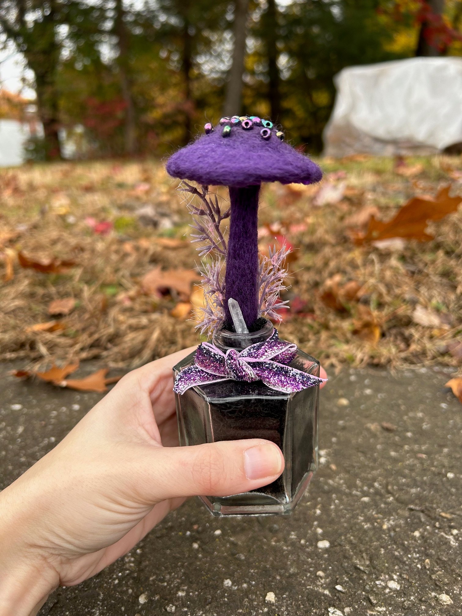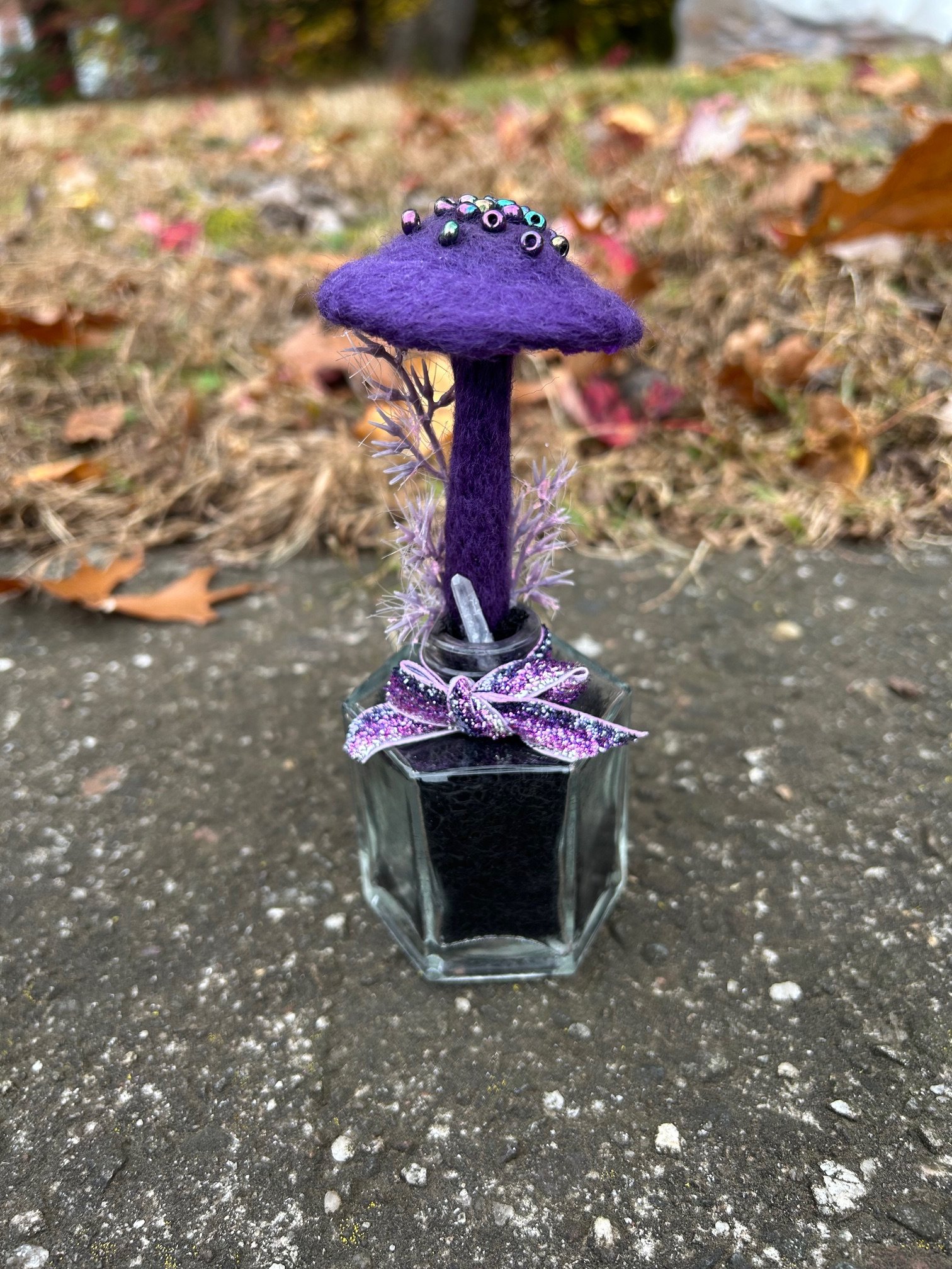 A purple felted mushroom in a glass bottle filled with black fake moss. Decorated with a sparkly purple bow and includes a small quartz point. A great gift for that witchy babe in your life ;)